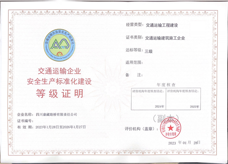 近日,經(jīng)四川省交通運(yùn)輸企業(yè)安全生產(chǎn)標(biāo)準(zhǔn)化評(píng)價(jià)機(jī)構(gòu)綜合評(píng)定,雅安交建集團(tuán)四川康藏路橋有限責(zé)任公司順利通過安全標(biāo)準(zhǔn)化三級(jí)評(píng)價(jià)驗(yàn)收并獲得“安全生產(chǎn)標(biāo)準(zhǔn)化三級(jí)企業(yè)”等級(jí)證明證書。
