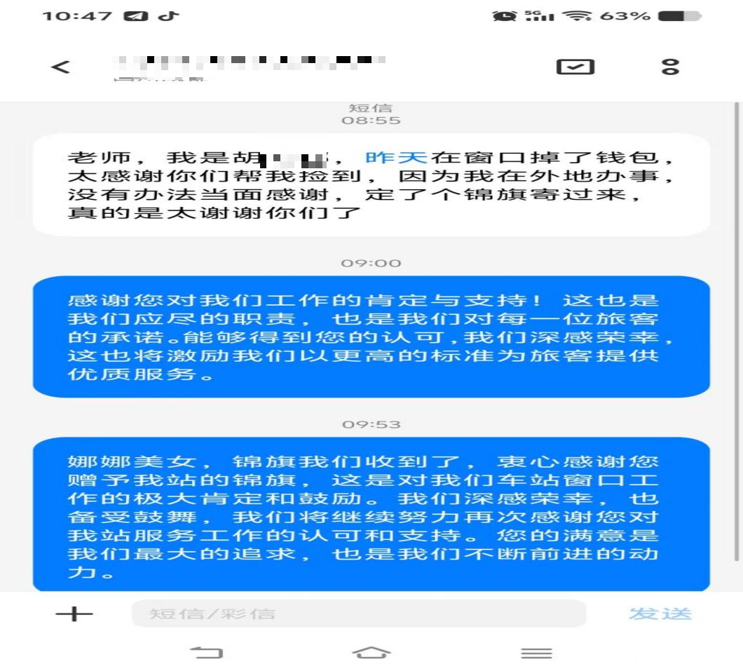 5月14日11時(shí)11分,售票員郝凌云發(fā)現(xiàn)柜臺上遺留了一個(gè)卡包,內(nèi)有現(xiàn)金 300 元、多張銀行卡、身份證及社保卡等重要物品。郝凌云第一時(shí)間上報(bào)值班科長,通過站務(wù)系統(tǒng)比對購票信息,僅用5分鐘便鎖定失主為即將前往漢源的旅客胡女士,此時(shí)胡女士正在等待檢票,尚未察覺錢包丟失。值班站長通過廣播系統(tǒng)緊急尋人,胡女士聽到廣播后立即前往值班室認(rèn)領(lǐng)物品,經(jīng)值班科長仔細(xì)核對身份及物品信息后,將卡包完好歸還。胡女士激動致謝:“太感謝你了!你們汽車站的工作人員素質(zhì)真高,太讓人暖心了!”
