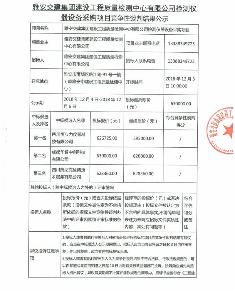 雅安交建集團(tuán)建設(shè)工程質(zhì)量檢測(cè)中心有限公司檢測(cè)儀器設(shè)備采購(gòu)項(xiàng)目競(jìng)爭(zhēng)性談判結(jié)果公示