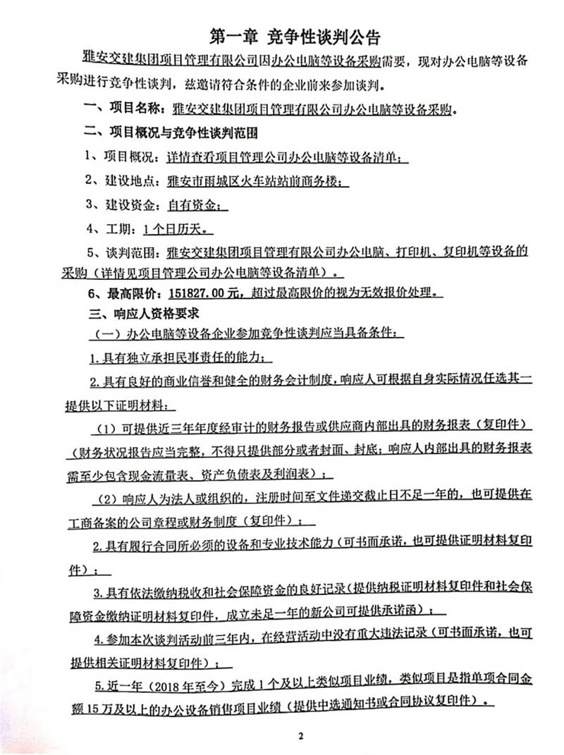 雅安交建集團(tuán)項(xiàng)目管理有限公司辦公電腦等設(shè)備采購(gòu)競(jìng)爭(zhēng)性談判公告