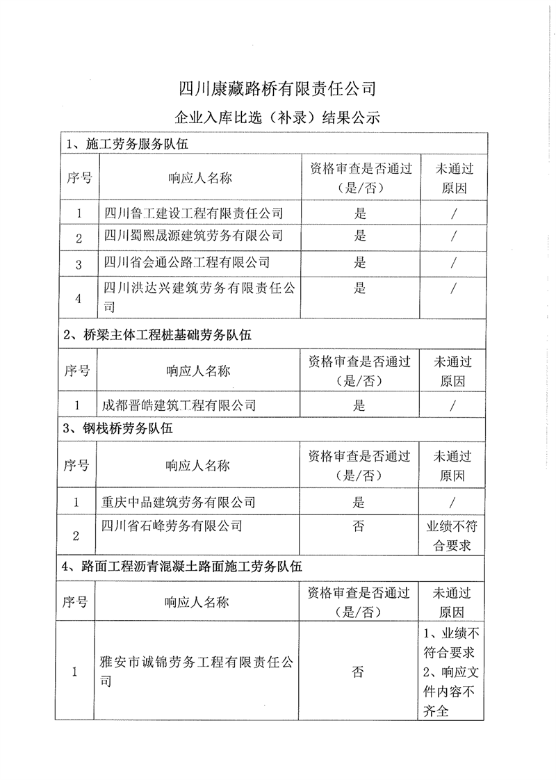 四川康藏路橋有限責任公司企業(yè)入庫比選(補錄)結(jié)果公示