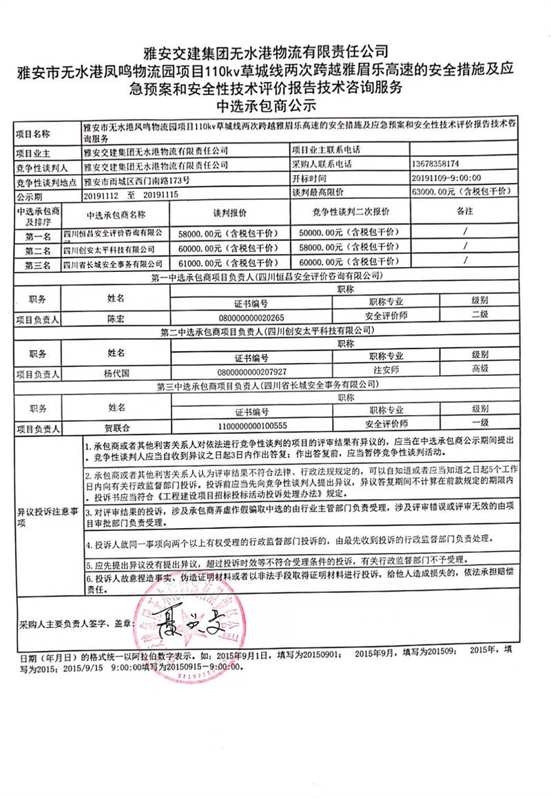 雅安交建集團無水港物流有限責(zé)任公司雅安市無水港鳳鳴物流園項目110kv草城線兩次跨越雅眉樂高速的安全措施、應(yīng)急預(yù)案以及安全性技術(shù)評價報告技術(shù)咨詢服務(wù)中選承包商公示