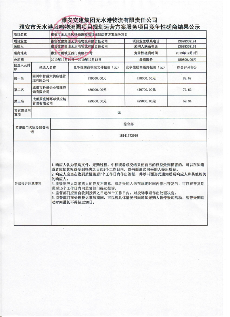 雅安交建集團(tuán)無(wú)水港物流有限責(zé)任公司雅安市無(wú)水港鳳鳴物流園項(xiàng)目規(guī)劃運(yùn)營(yíng)方案服務(wù)項(xiàng)目競(jìng)爭(zhēng)性磋商結(jié)果公示