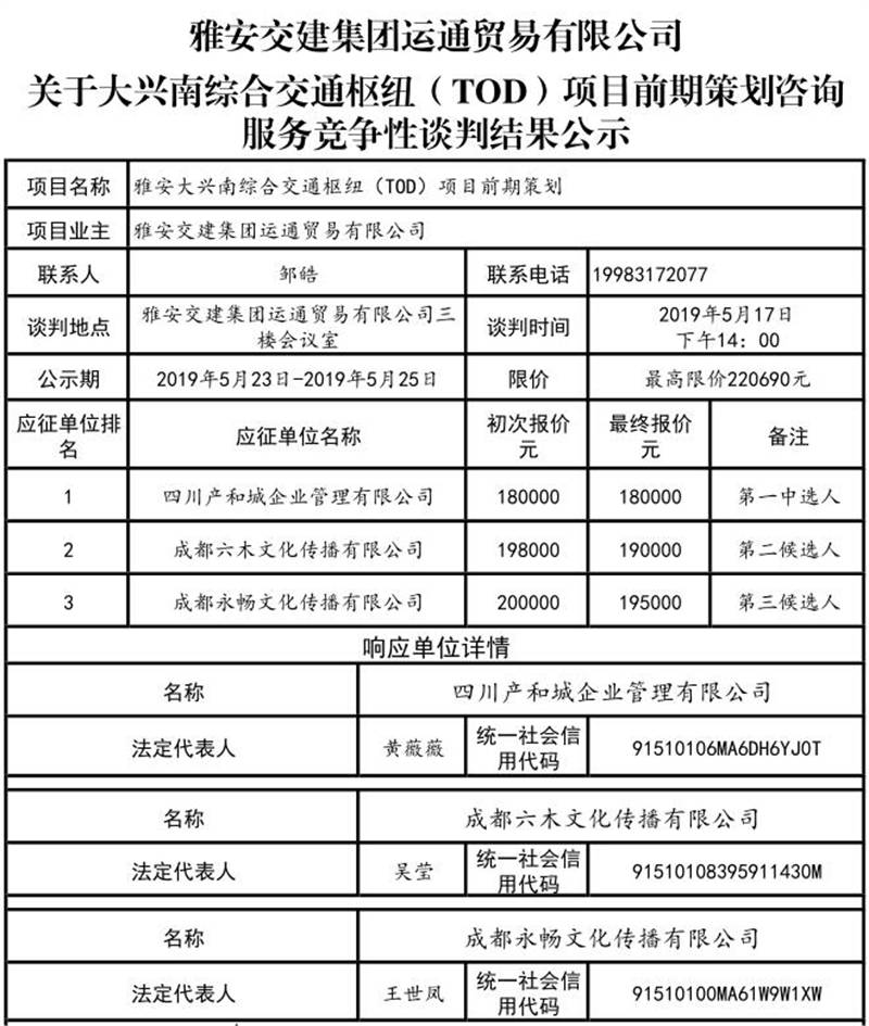 雅安交建集團(tuán)運(yùn)通貿(mào)易有限公司關(guān)于大興南綜合樞紐(TOD)項(xiàng)目前期策劃咨詢(xún)服務(wù)競(jìng)爭(zhēng)性談判結(jié)果公司