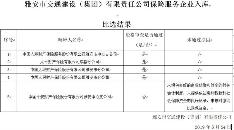 雅安市交通建設(shè)(集團(tuán))有限責(zé)任公司保險(xiǎn)服務(wù)企業(yè)入庫(kù)比選結(jié)果公示