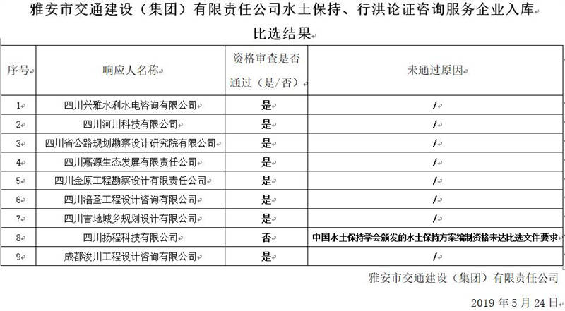 雅安市交通建設(集團)有限責任公司水土保持、行洪論證咨詢服務企業(yè)入庫比選結果公示