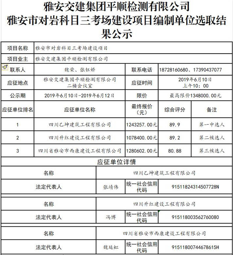 雅安交建集團(tuán)平順檢測有限公司雅安市對巖科目三考場建設(shè)項(xiàng)目編制單位選取結(jié)果公示
