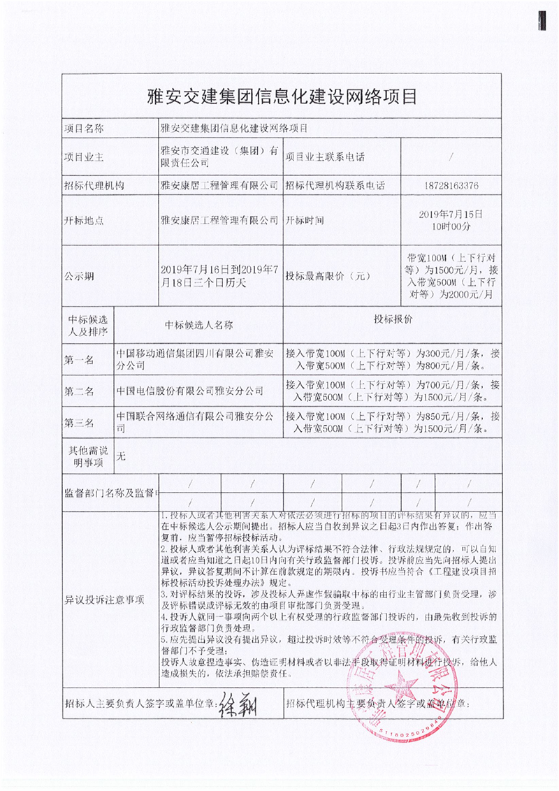 雅安交建集團信息化建設(shè)網(wǎng)絡(luò)項目競爭性談判結(jié)果公示