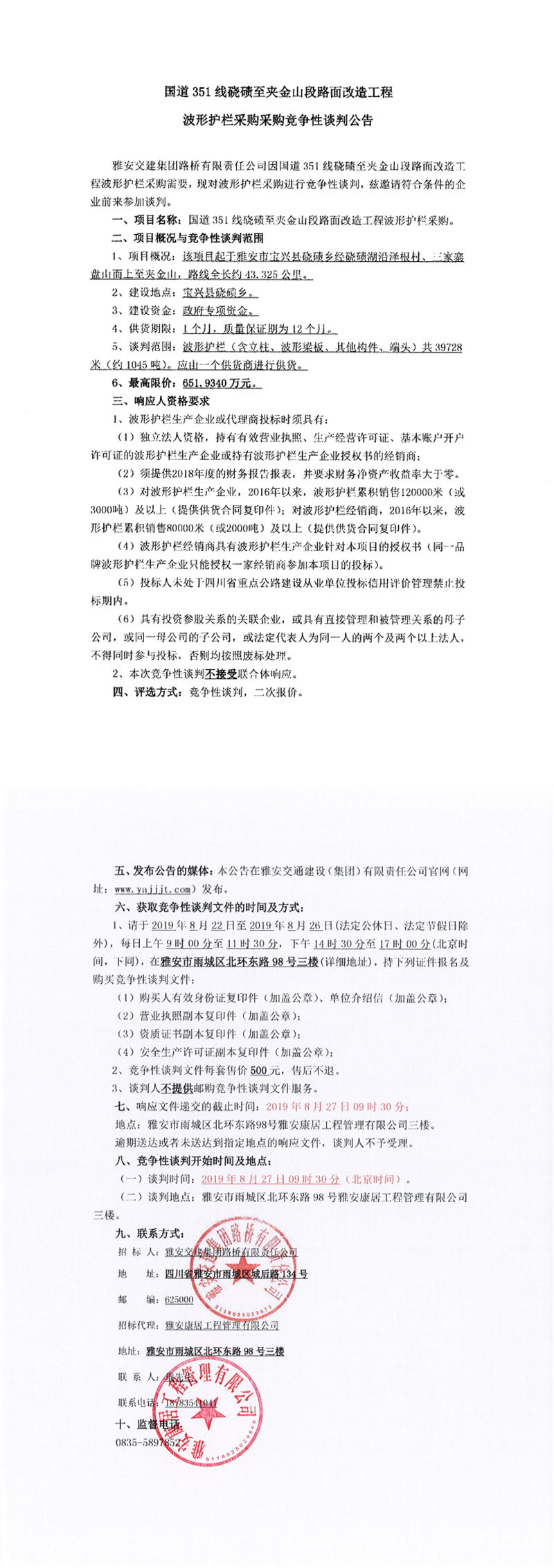雅安交建集團(tuán)路橋有限責(zé)任公司國道351線磽磧至夾金山段路面改造工程波形護(hù)欄采購項(xiàng)目競(jìng)爭性談判公告