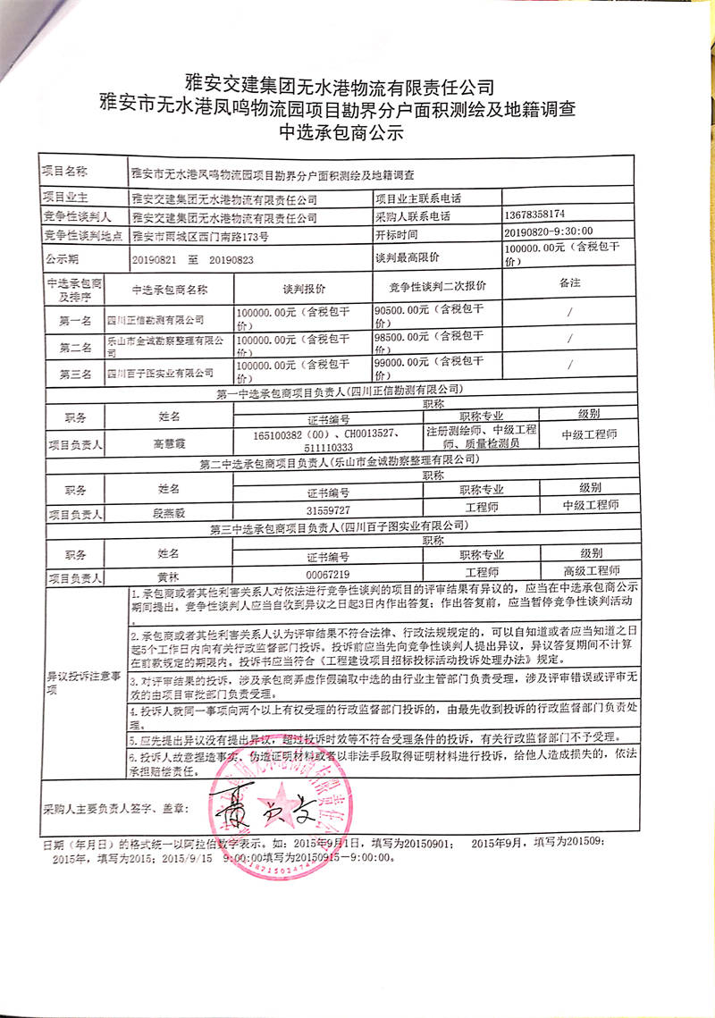 雅安交建集團(tuán)無水港物流有限責(zé)任公司雅安市無水港鳳鳴物流園項(xiàng)目勘界分戶面積測繪及地籍調(diào)查中選承包商公示