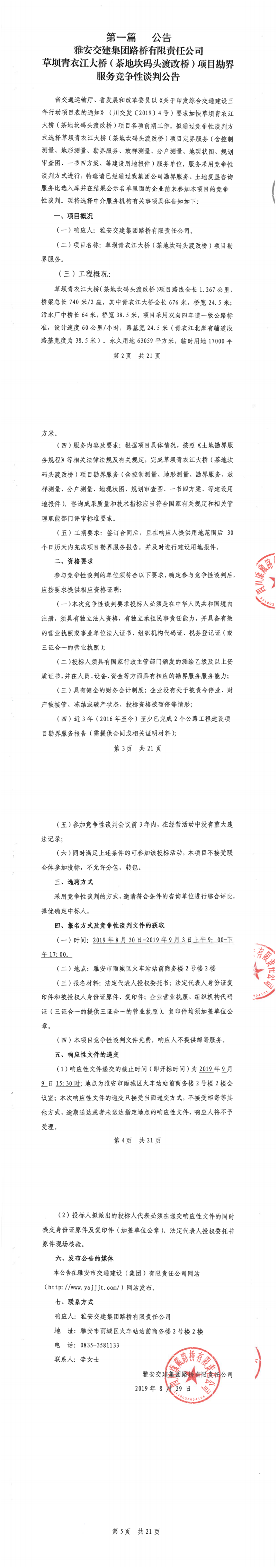 雅安交建集團(tuán)路橋有限責(zé)任公司草壩青衣江大橋(茶地坎碼頭渡改橋)項目勘界服務(wù)競爭性談判公告