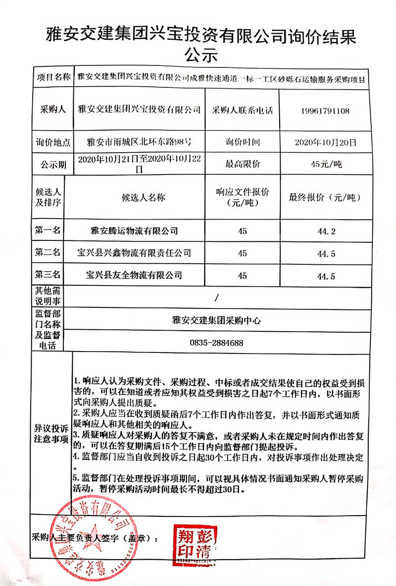 雅安交建集團興寶投資有限公司成雅快速通道一標(biāo)一工區(qū)砂礫石運輸服務(wù)采購項目詢價結(jié)果公示