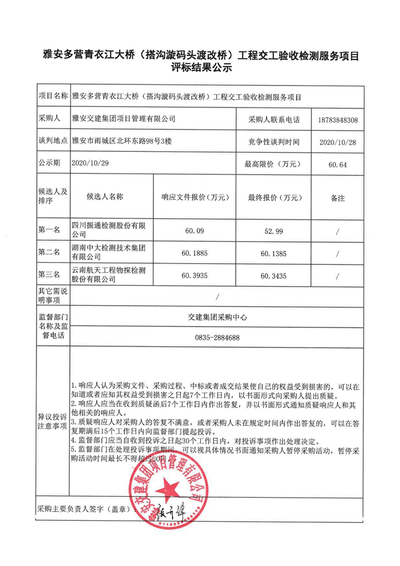 雅安交建集團項目管理有限公司雅安多營青衣江大橋(搭溝漩碼頭渡改橋)工程交工驗收檢測服務(wù)項目評標結(jié)果公示