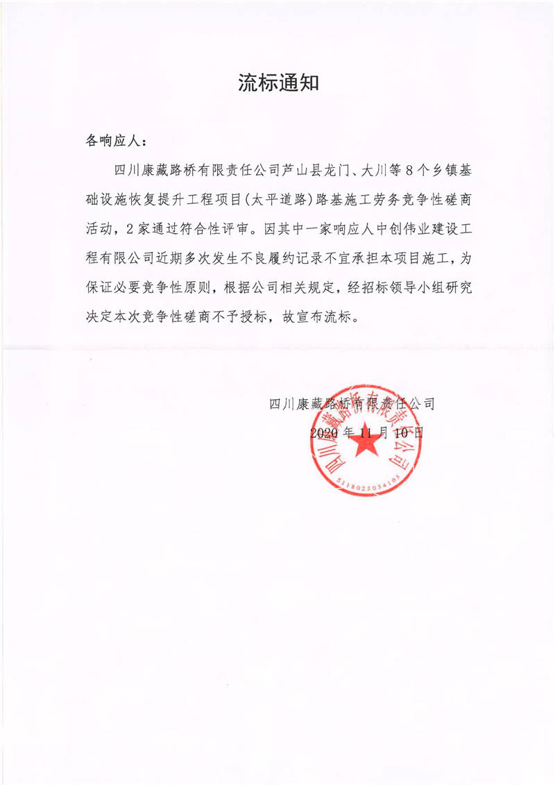 四川康藏路橋有限責(zé)任公司蘆山縣龍門、大川等8個鄉(xiāng)鎮(zhèn)基礎(chǔ)設(shè)施恢復(fù)提升工程項(xiàng)目(太平道路)路基施工勞務(wù)流標(biāo)通知