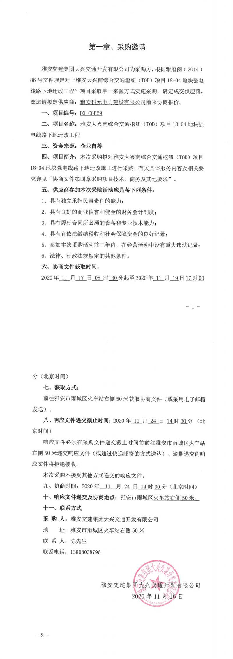 雅安交建集團大興交通開發(fā)有限公司雅安大興南綜合交通樞紐(TOD)項目18-04地塊強電線路下地遷改工程單一來源采購邀請
