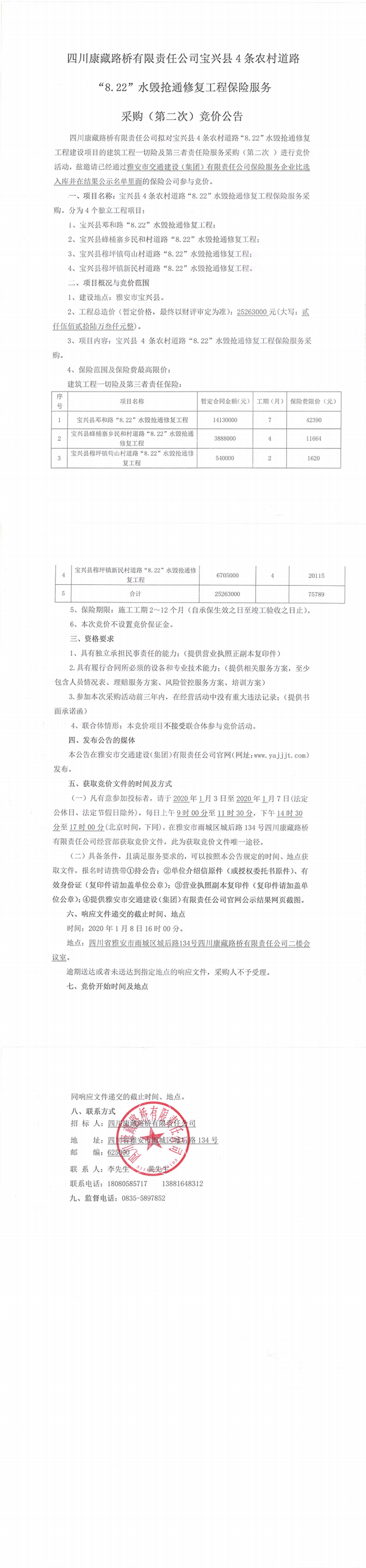 四川康藏路橋有限責(zé)任公司寶興縣4條農(nóng)村道路“8.22”水毀搶通修復(fù)工程保險(xiǎn)服務(wù)采購(第二次)競價(jià)公告