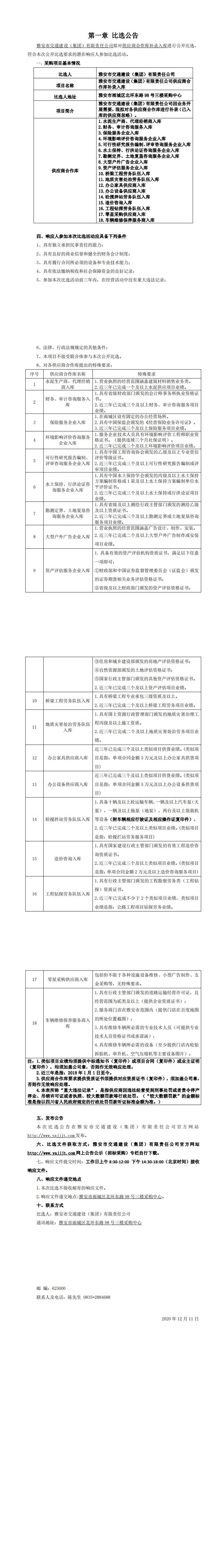 雅安市交通建設(shè)(集團(tuán))有限責(zé)任公司供應(yīng)商合作庫(kù)補(bǔ)錄入庫(kù)比選公告