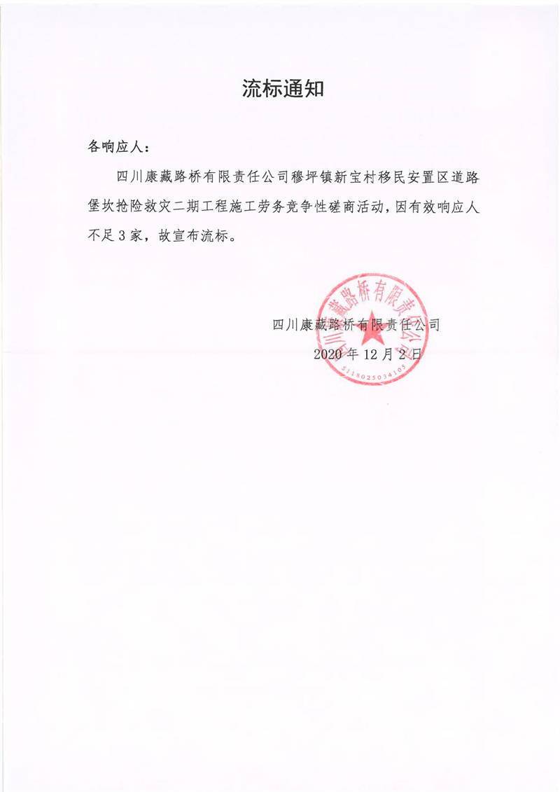 四川康藏路橋有限責(zé)任公司穆坪鎮(zhèn)新寶村移民安置區(qū)道路堡坎搶險(xiǎn)救災(zāi)二期工程施工勞務(wù)流標(biāo)通知