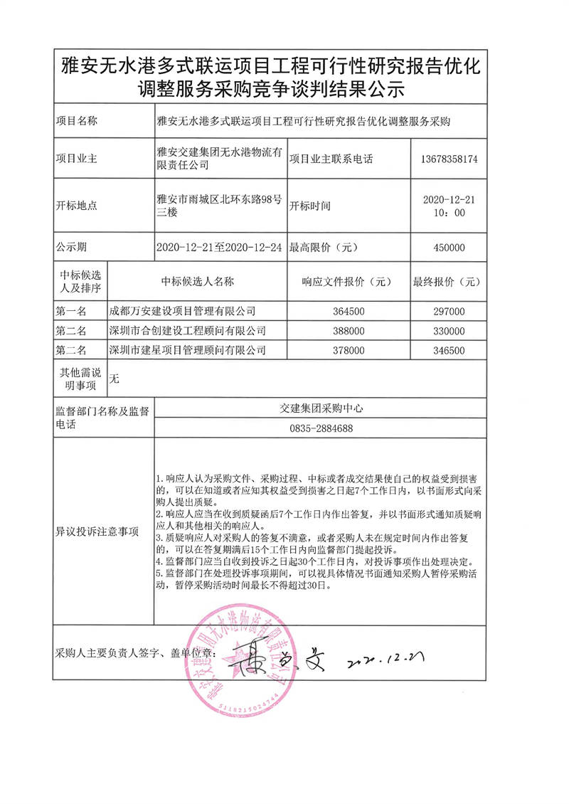 雅安交建集團(tuán)無水港物流有限責(zé)任公司雅安無水港多式聯(lián)運(yùn)項(xiàng)目工程可行性研究報(bào)告優(yōu)化調(diào)整服務(wù)采購(gòu)競(jìng)爭(zhēng)談判結(jié)果公示