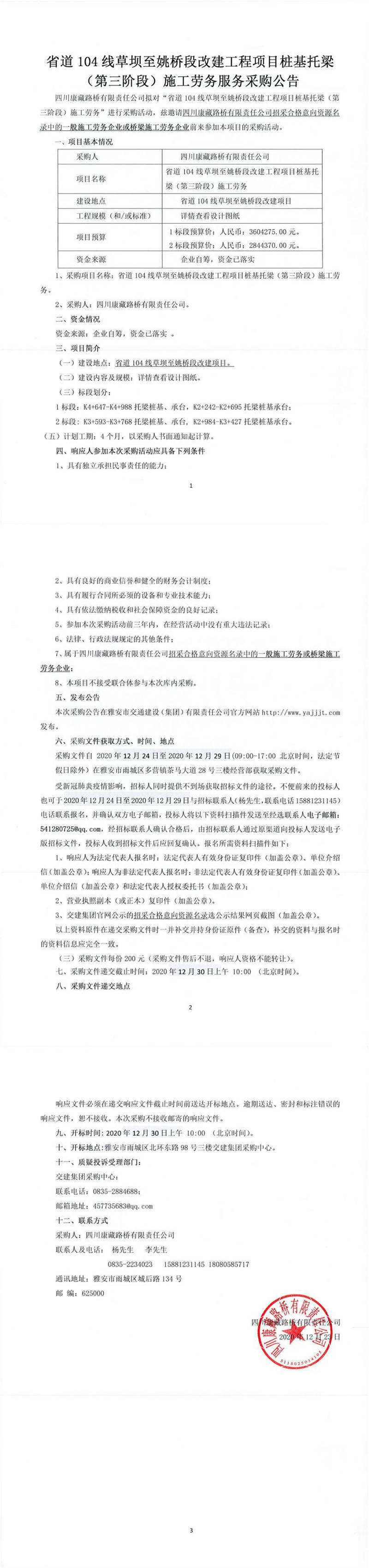 四川康藏路橋有限責任公司省道104線草壩至姚橋段改建工程項目樁基托梁(第三階段)施工勞務服務采購公告