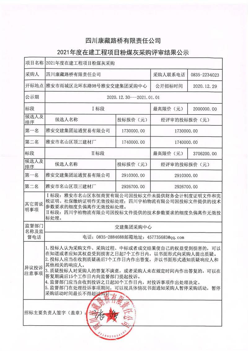 四川康藏路橋有限責(zé)任公司2021年度在建工程項(xiàng)目粉煤灰采購(gòu)評(píng)審結(jié)果公示