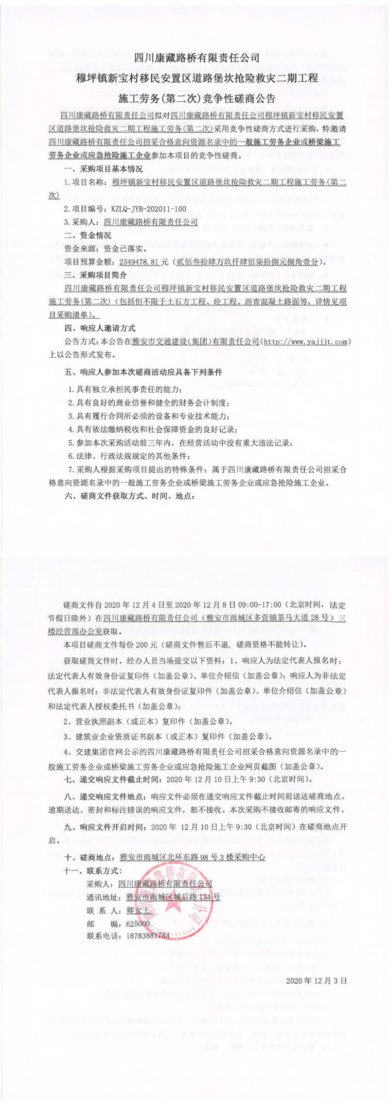 四川康藏路橋有限責(zé)任公司穆坪鎮(zhèn)新寶村移民安置區(qū)道路堡坎搶險救災(zāi)二期工程施工勞務(wù)(第二次)競爭性磋商公告