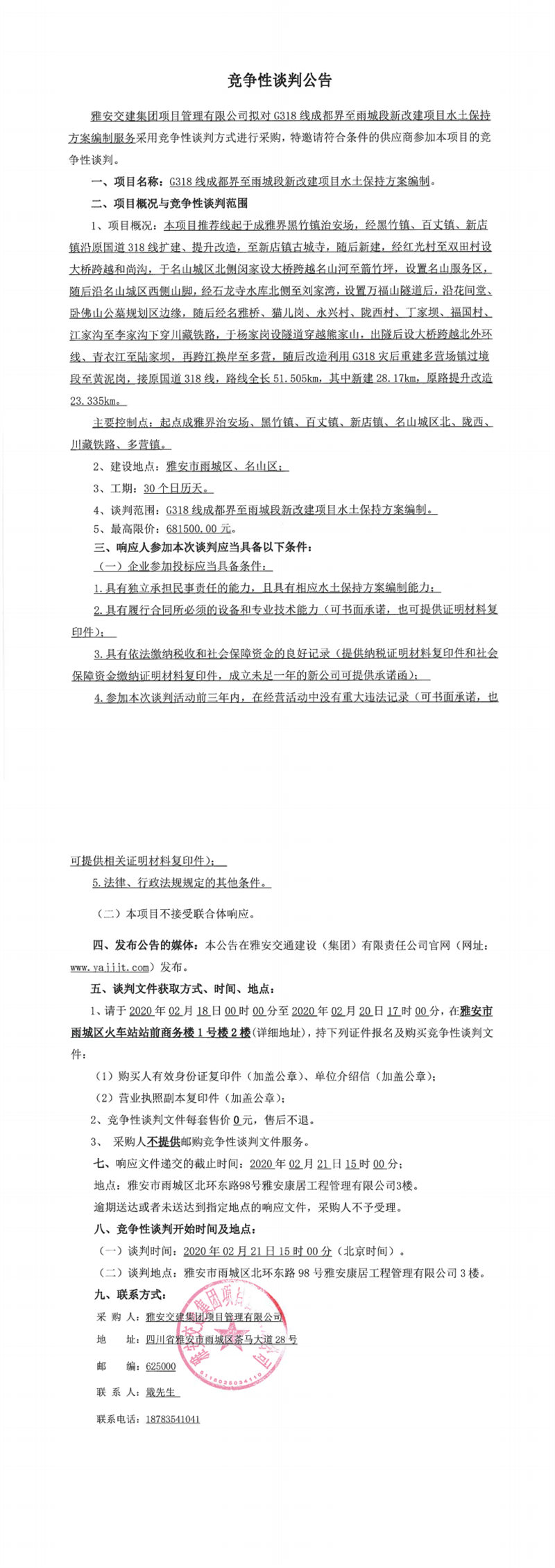 雅安交建集團(tuán)項(xiàng)目管理有限公司G318線成都界至雨城段新改建項(xiàng)目水土保持方案編制競爭性談判公告