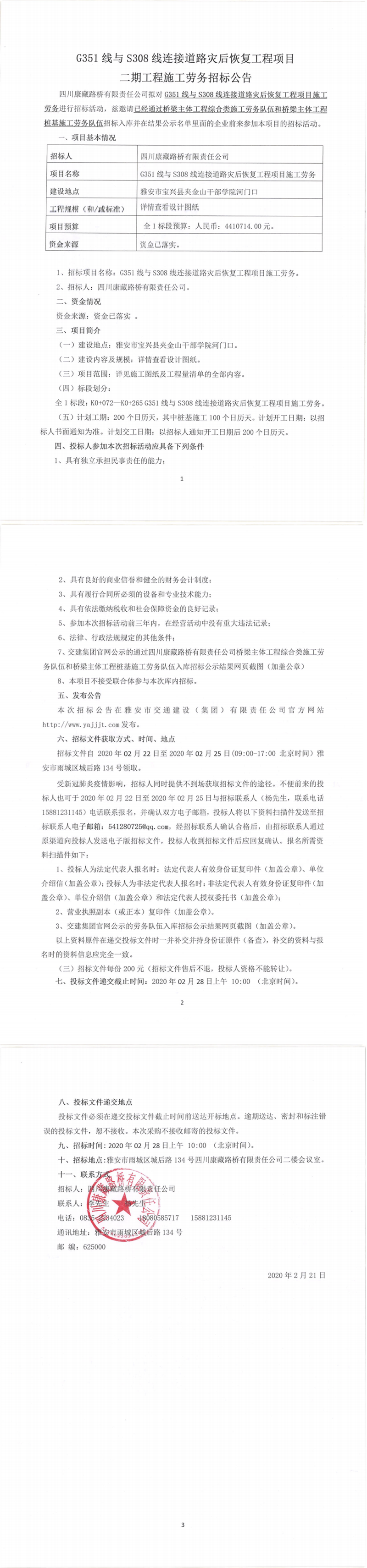 四川康藏路橋有限責(zé)任公司G351線與S308線連接道路災(zāi)后恢復(fù)工程項目二期工程施工勞務(wù)招標公告