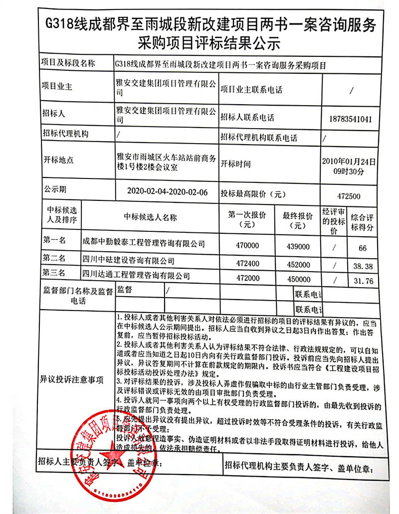 雅安交建集團(tuán)項(xiàng)目管理有限公司G318線成都界至雨城段新改建項(xiàng)目兩書一案咨詢服務(wù)采購項(xiàng)目評(píng)標(biāo)結(jié)果公示