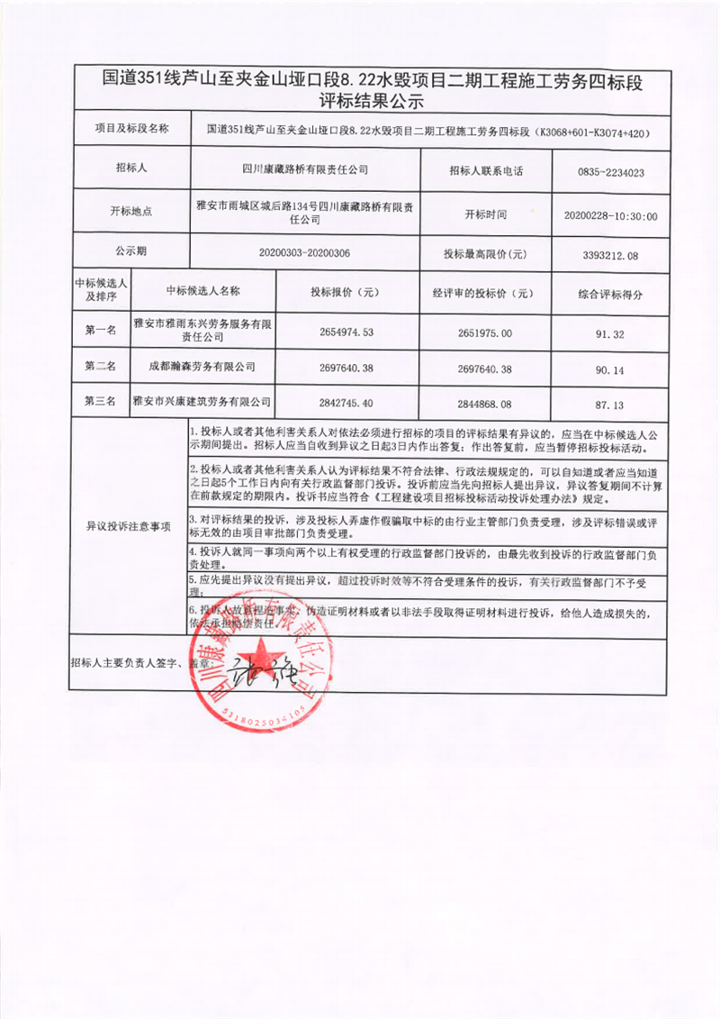 四川康藏路橋有限責(zé)任公司國道351線蘆山至夾金山埡口段8.22水毀項(xiàng)目二期工程施工勞務(wù)三標(biāo)段評(píng)標(biāo)結(jié)果公示
