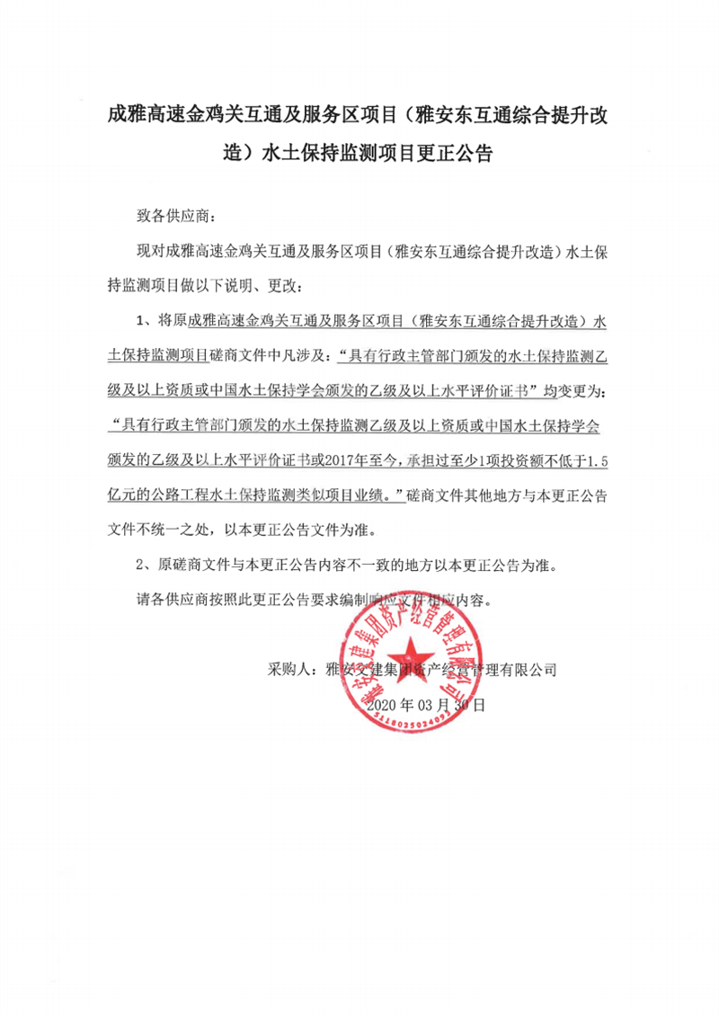 雅安交建集團資產(chǎn)經(jīng)營管理有限公司成雅高速金雞關(guān)互通及服務區(qū)項目(雅安東互通綜合提升改造)水土保持監(jiān)測項目更正公告