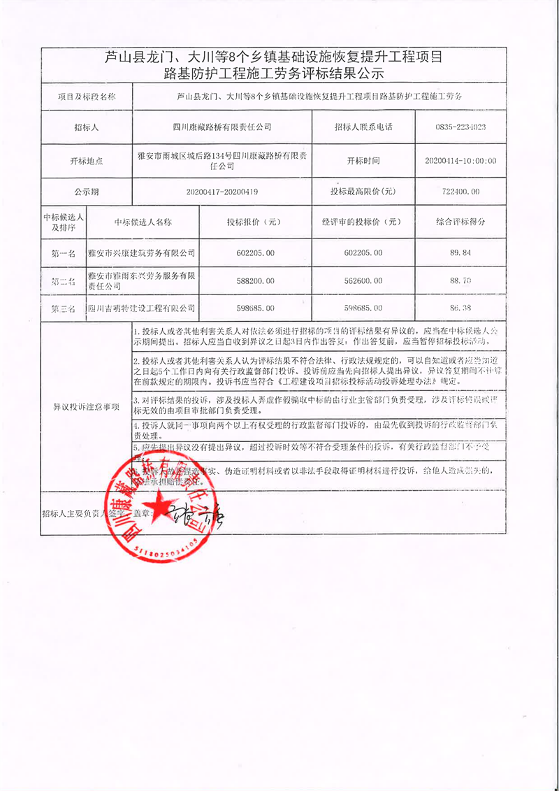 四川康藏路橋有限責(zé)任公司蘆山縣龍門、大川等8個(gè)鄉(xiāng)鎮(zhèn)基礎(chǔ)設(shè)施恢復(fù)提升工程項(xiàng)目路基防護(hù)工程施工勞務(wù)評(píng)標(biāo)結(jié)果公示