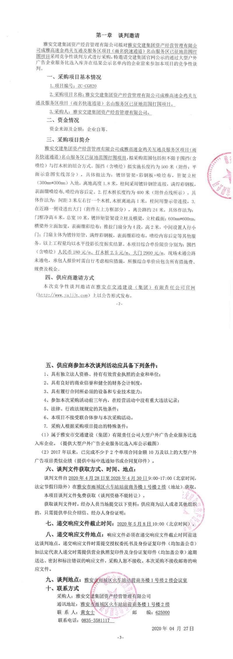 雅安交建集團資產(chǎn)經(jīng)營管理有限公司成雅高速金雞關(guān)互通及服務(wù)區(qū)項目(雨名快速通道)名山服務(wù)區(qū)已征地范圍打圍項目競爭性談判公告