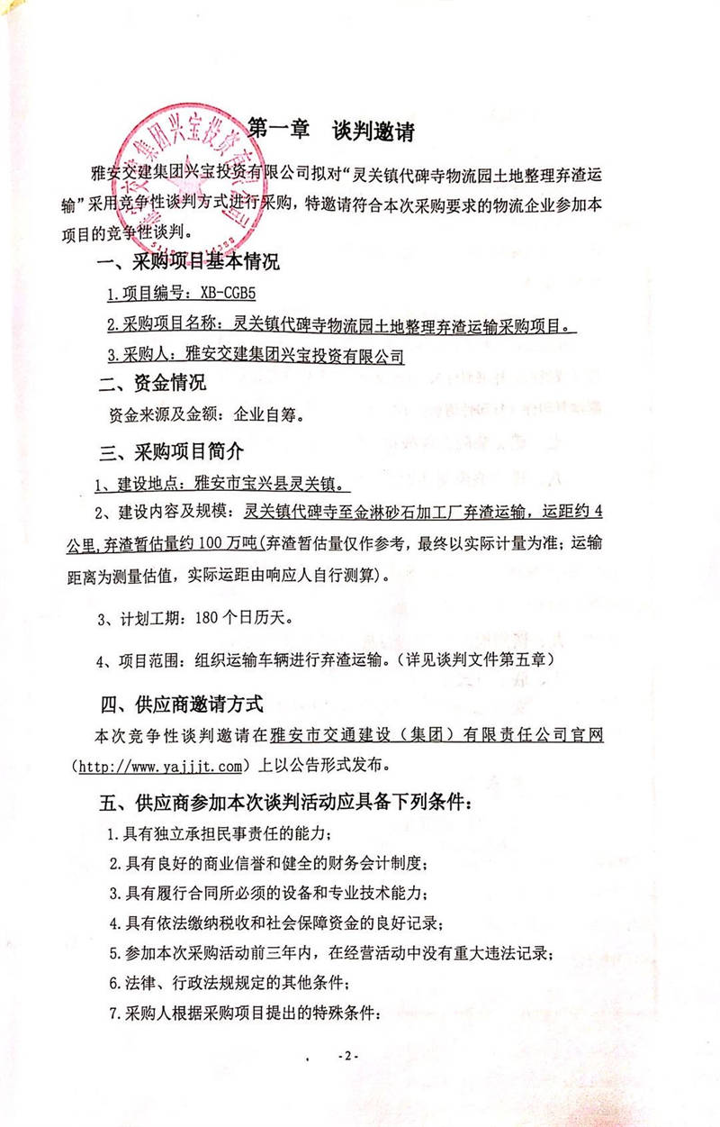 雅安交建集團(tuán)興寶投資有限公司靈關(guān)鎮(zhèn)代碑寺物流園土地整理棄渣運(yùn)輸采購項目競爭性談判公告