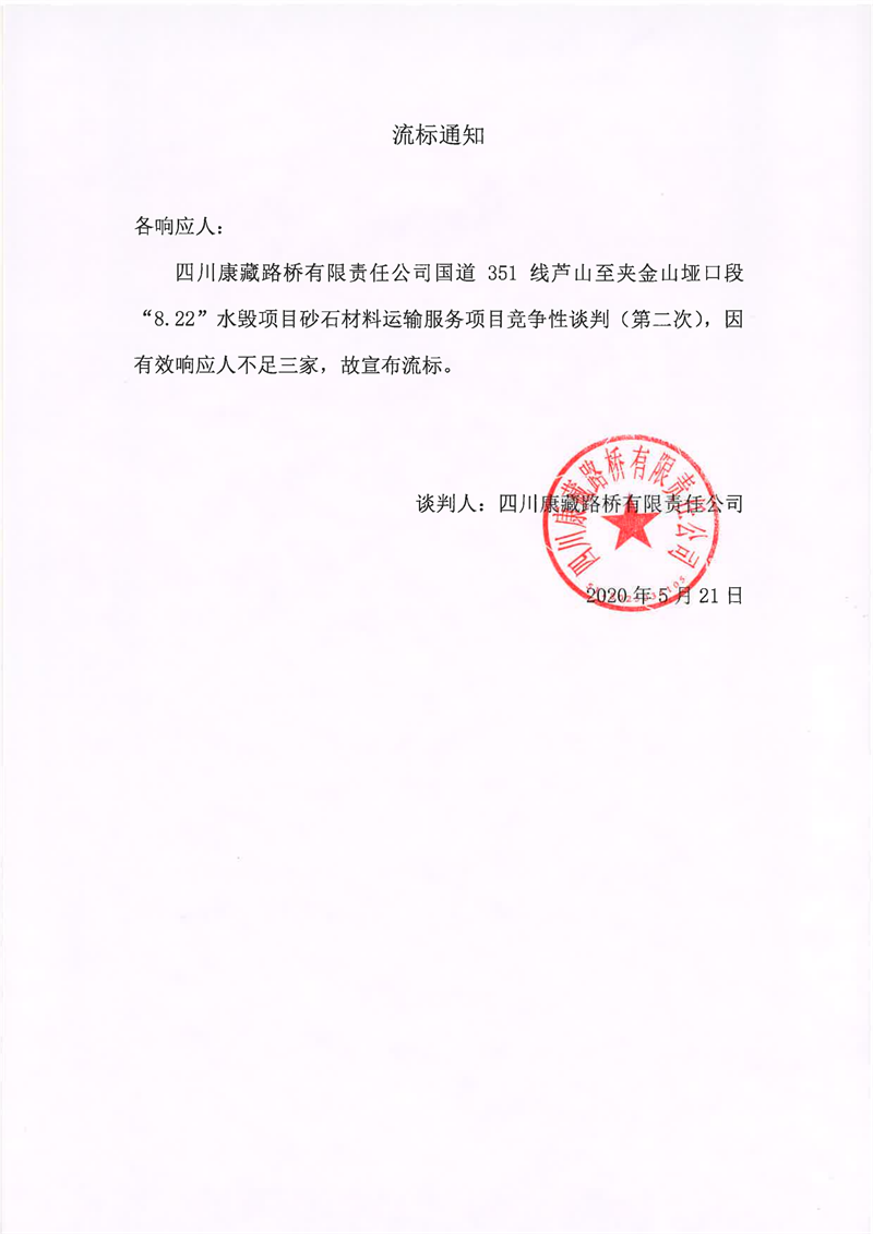 四川康藏路橋有限責(zé)任公司國道351線蘆山至夾金山埡口段8.22水毀項目砂石材料運輸服務(wù)項目(第二次)流標(biāo)通知