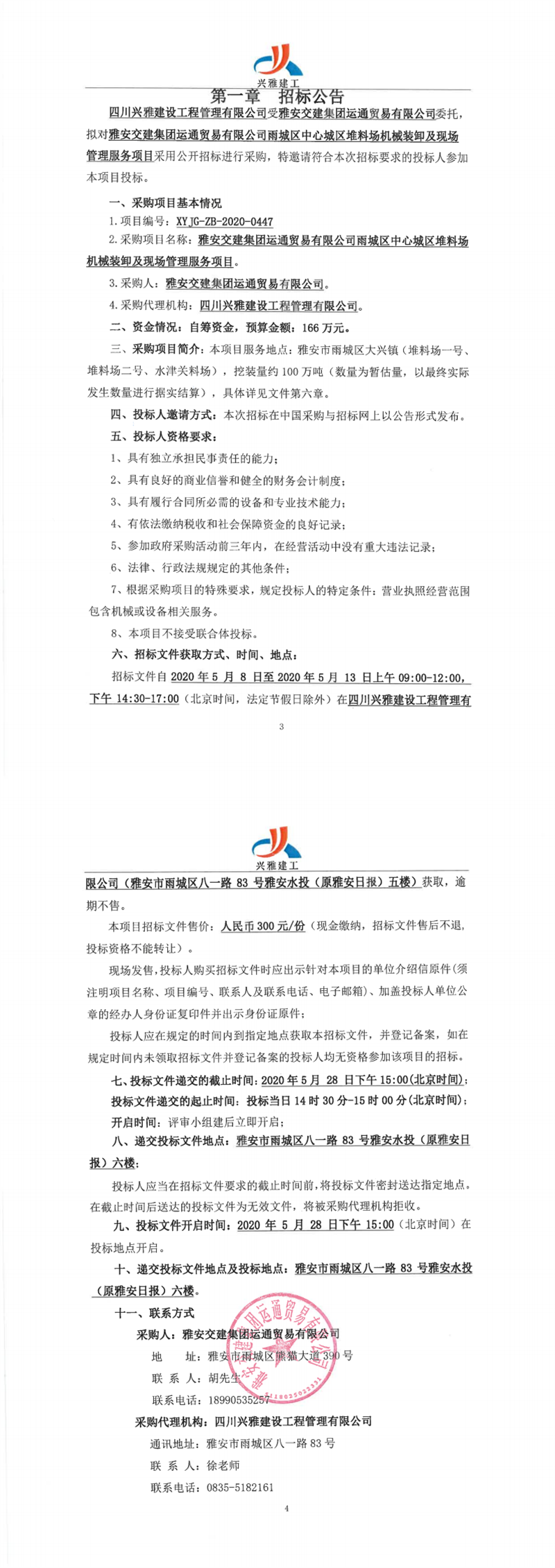 雅安交建集團運通貿易有限公司雨城區(qū)中心城區(qū)堆料場機械裝卸及現(xiàn)場管理服務項目招標公告