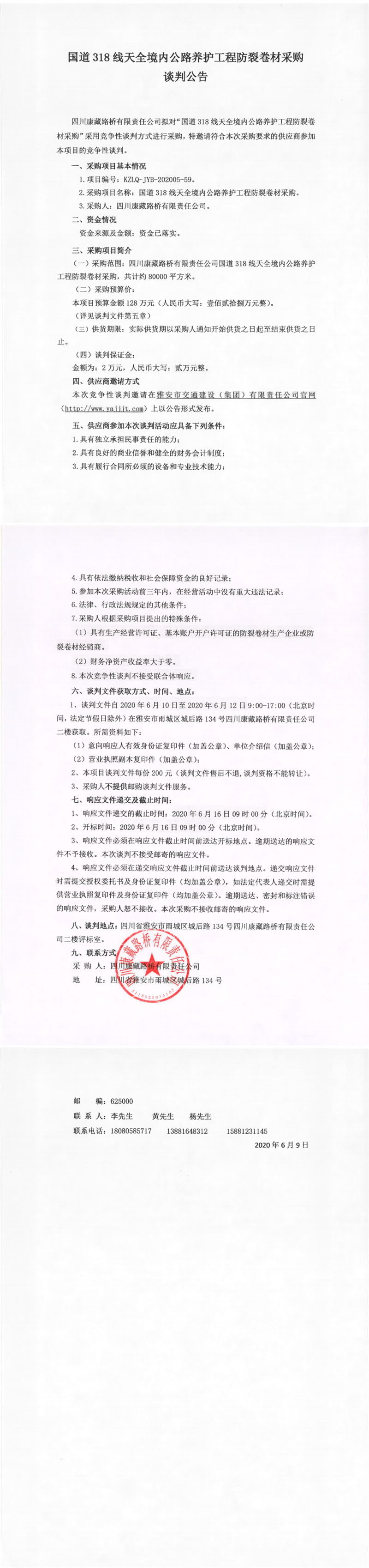 四川康藏路橋有限責(zé)任公司國道318線天全境內(nèi)公路養(yǎng)護(hù)工程防裂卷材采購競(jìng)爭(zhēng)性談判公告