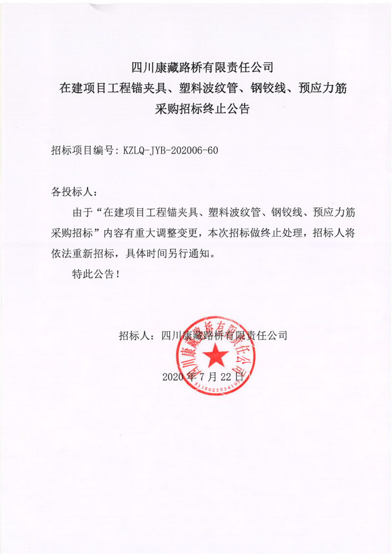 四川康藏路橋有限責(zé)任公司在建項(xiàng)目工程錨夾具、塑料波紋管、鋼鉸線、預(yù)應(yīng)力筋采購招標(biāo)終止公告