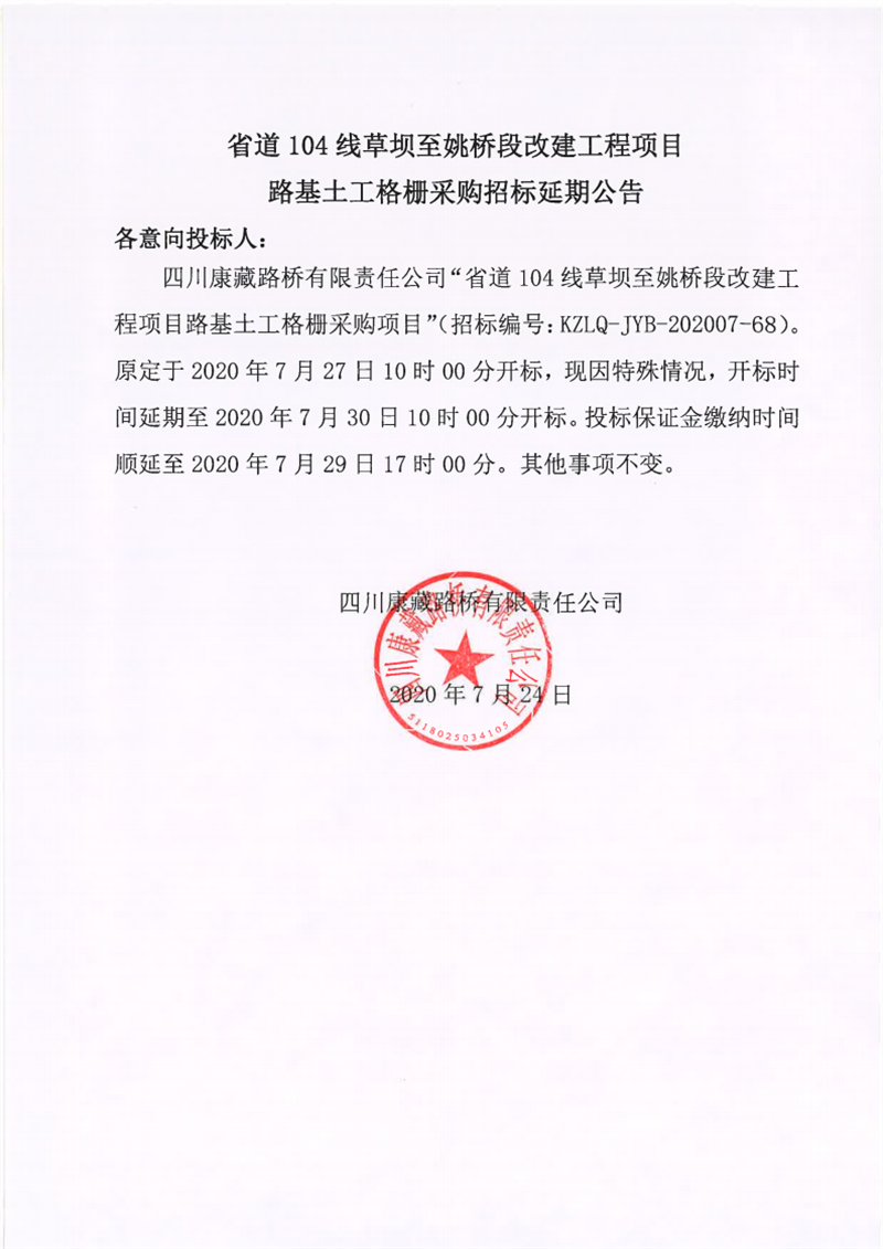 四川康藏路橋有限責任公司省道104線草壩至姚橋段改建工程項目路基土工格柵采購招標延期公告