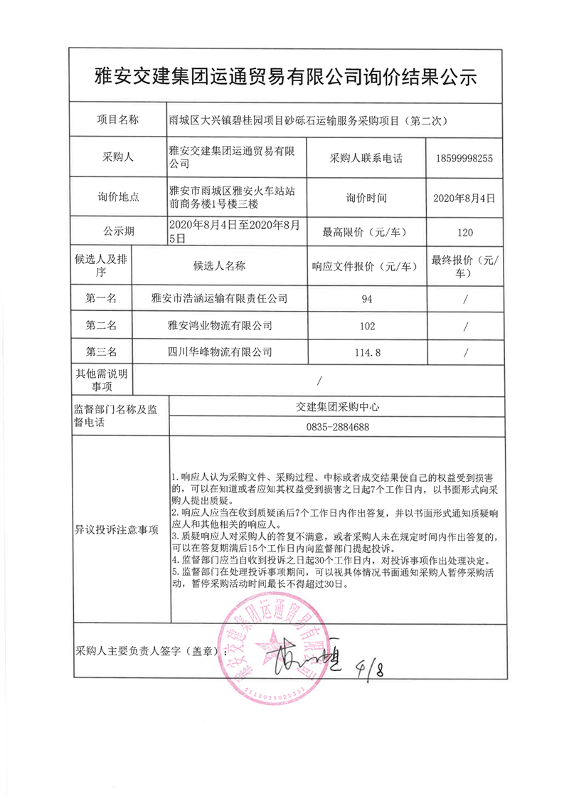 雅安交建集團(tuán)運(yùn)通貿(mào)易有限公司雨城區(qū)大興鎮(zhèn)碧桂園項(xiàng)目砂礫石運(yùn)輸服務(wù)采購(gòu)項(xiàng)目(第二次)詢(xún)價(jià)結(jié)果公示