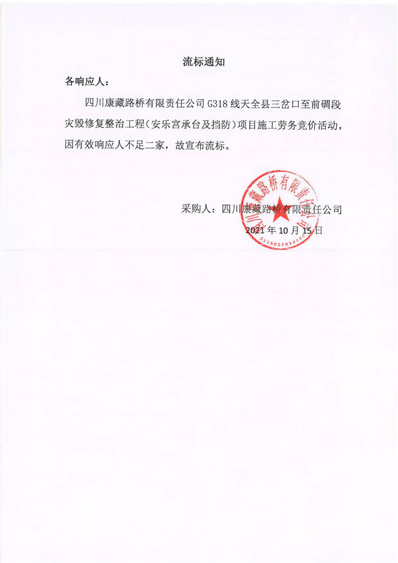 四川康藏路橋有限責(zé)任公司G318線天全縣三岔口至前碉段災(zāi)毀修復(fù)整治工程(安樂(lè)宮承臺(tái)及擋防)項(xiàng)目施工勞務(wù)流標(biāo)通知