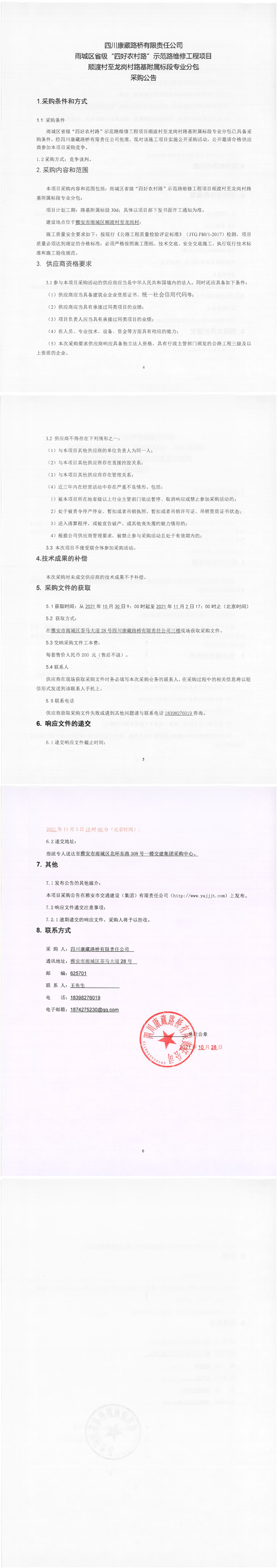 四川康藏路橋有限責(zé)任公司雨城區(qū)省級(jí)“四好農(nóng)村路”示范路維修工程項(xiàng)目順渡村至龍崗村路基附屬標(biāo)段專(zhuān)業(yè)分包采購(gòu)公告
