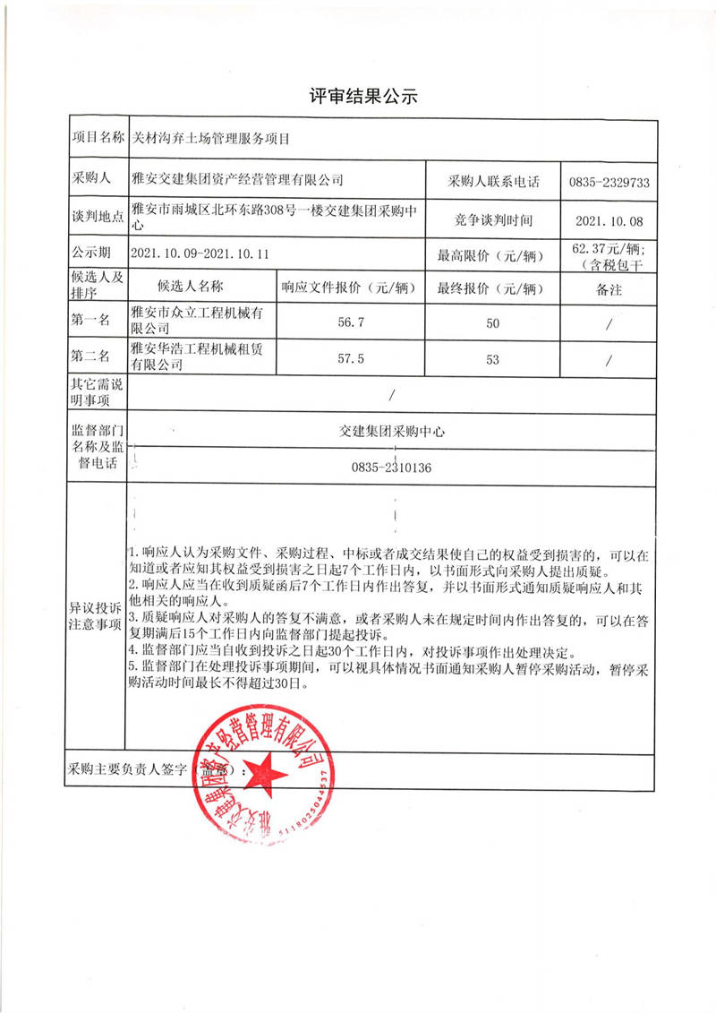 雅安交建集團(tuán)資產(chǎn)經(jīng)營管理有限公司關(guān)材溝棄土場管理服務(wù)項(xiàng)目評審結(jié)果公示