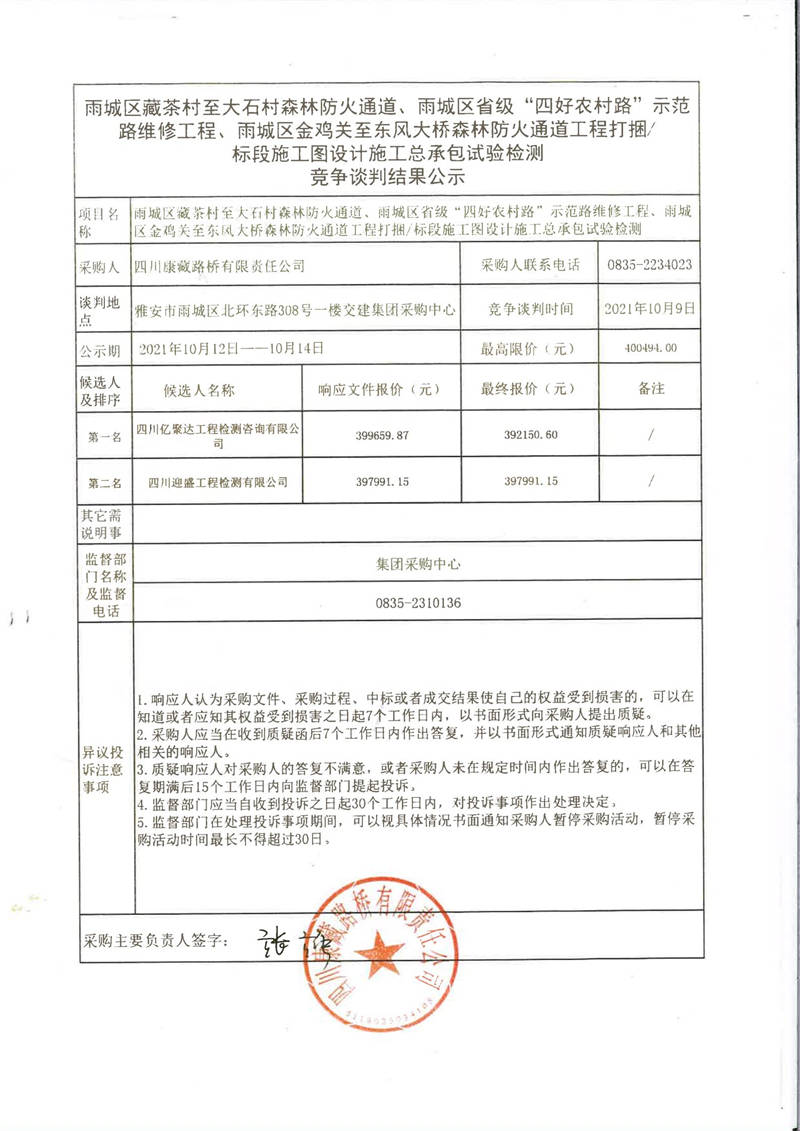 四川康藏路橋有限責(zé)任公司雨城區(qū)藏茶村至大石村森林防火通道、雨城區(qū)省級“四好農(nóng)村路”示范路維修工程、雨城區(qū)金雞關(guān)至東風(fēng)大橋森林防火通道工程打捆/標段施工圖設(shè)計施工總承包試驗檢測競爭談判結(jié)果公示