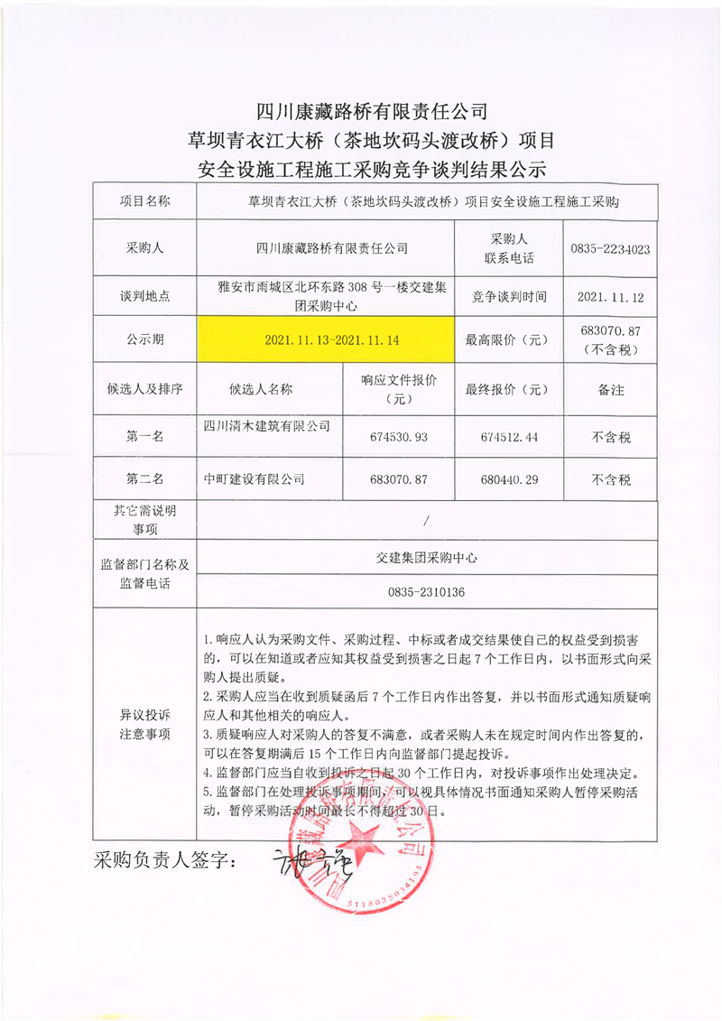 四川康藏路橋有限責任公司草壩青衣江大橋(茶地坎碼頭渡改橋)項目安全設施施工采購競爭談判結果公示