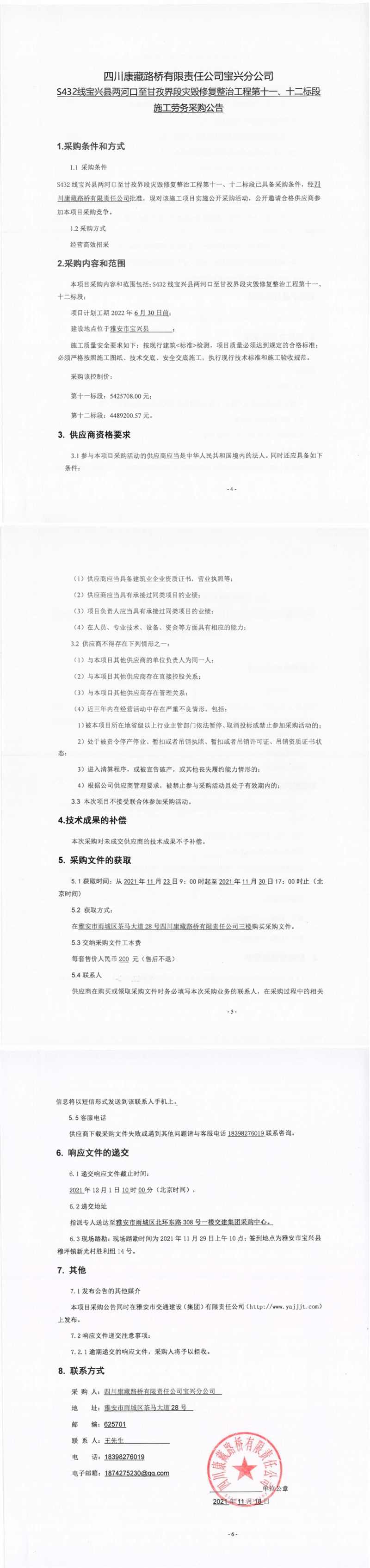 四川康藏路橋有限責任公司寶興分公司S432線寶興縣兩河口至甘孜界段災毀修復整治工程第十一、十二標段施工勞務采購公告