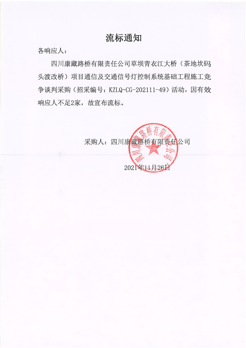 四川康藏路橋有限責(zé)任公司草壩青衣江大橋(茶地坎碼頭渡改橋)項(xiàng)目通信及交通信號燈控制系統(tǒng)基礎(chǔ)工程施工采購流標(biāo)通知