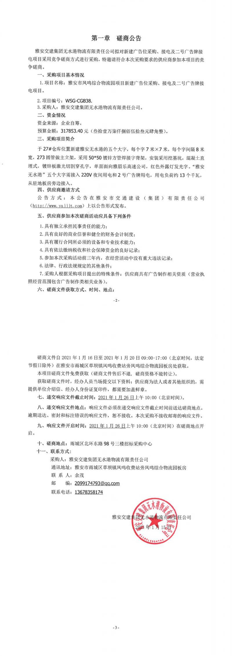 雅安交建集團(tuán)無水港物流有限責(zé)任公司雅安市鳳鳴綜合物流園項(xiàng)目新建廣告位采購(gòu)、接電及二號(hào)廣告牌接電項(xiàng)目磋商公告