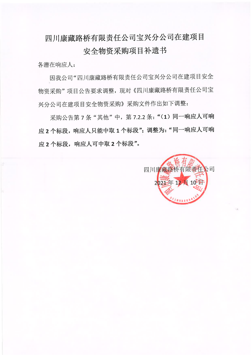 四川康藏路橋有限責任公司寶興分公司在建項目安全物資采購項目補遺書