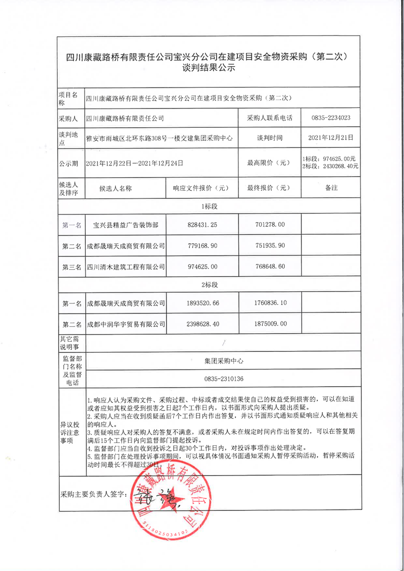 四川康藏路橋有限責(zé)任公司寶興分公司在建項目安全物資采購(第二次)談判結(jié)果公示